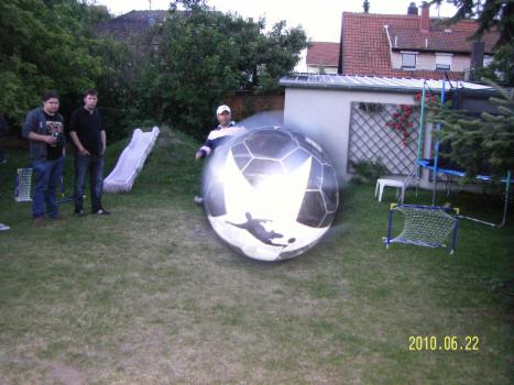 Das Runde (der Ball) sollte das Loch in der Torwand treffen. Knallte allerdings an die Latte des Tors